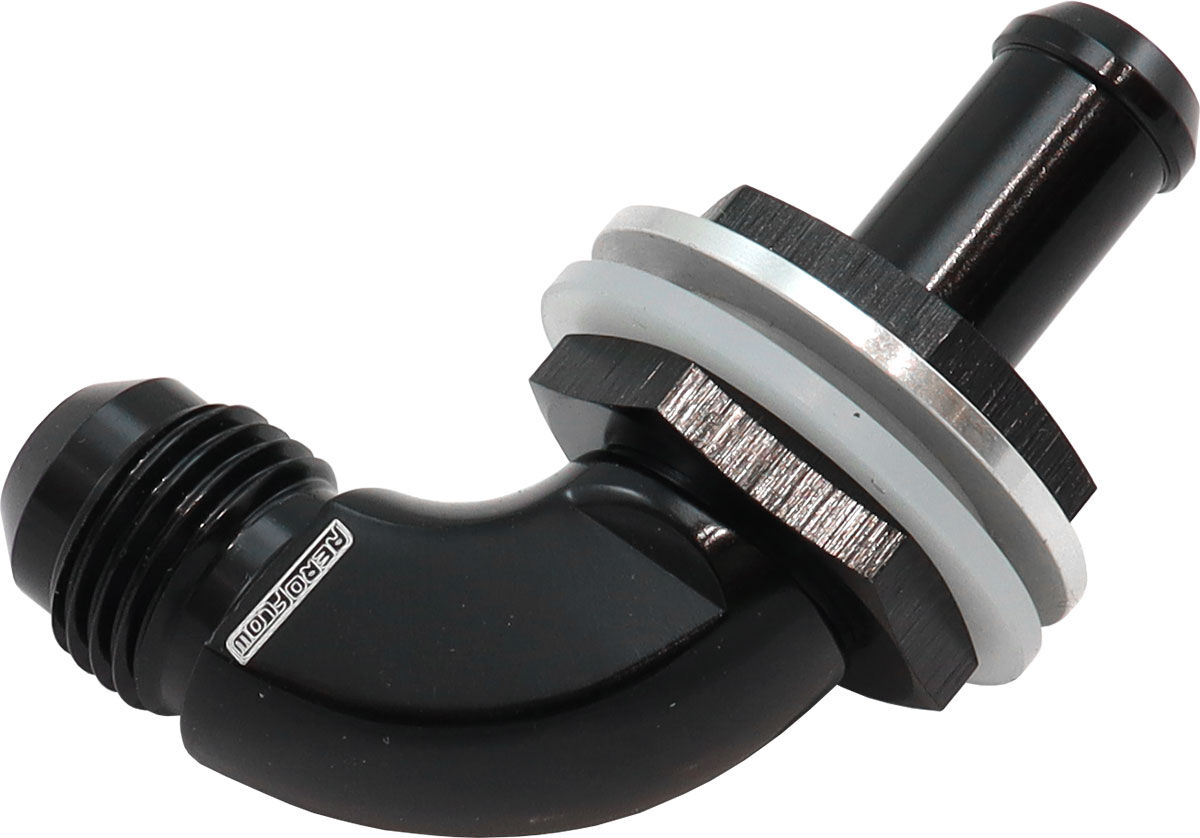 This Aeroflow Performance high flow 90 degree bulkhead fitting is designed for use in fuel cells. They feature a radius on Inlet for unrestricted flow. Each bulkhead fitting includes 2 PTFE washers and a bulkhead nut. These fittings can also be used for adding a breather to a valve cover, or a drain on a fabricated tank whether it is a plastic or metal material.