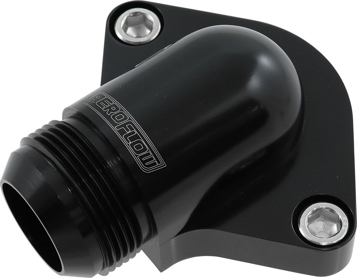 The Aeroflow Performance low profile billet thermostat housings are designed as low as possible to ensure clearance on various intake manifolds. This low profile also allows a direct plumbing path to the radiator. Machined from T6-6061 billet aluminium with a male -20AN outlet. All Aeroflow Performance thermostat housings feature an O-ring base flange, as opposed to using the factory paper style gasket, this ensured a superior leak free seal.