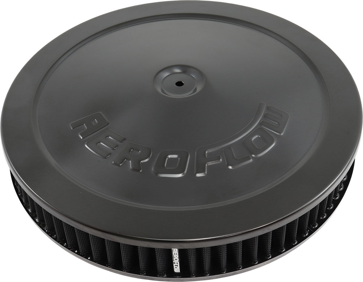 Stand out from the crowd with a magnificent looking Aeroflow air cleaner. These air cleaners are stamped from high quality steel. Available in many different great finishes and styles for that custom look you are after. Chrome-plated or black finish with reusable/washable or paper elements. Aeroflow air filter assemblies work with all popular standard 4150 (5-1/8"" / 130mm) carburettors and 4500 Dominator (7-5/16"" /186mm) carburettors. The 14"" (355.60mm) air filter assemblies come with a drop base that sits 1-1/8"" (28mm) below the carburettor.