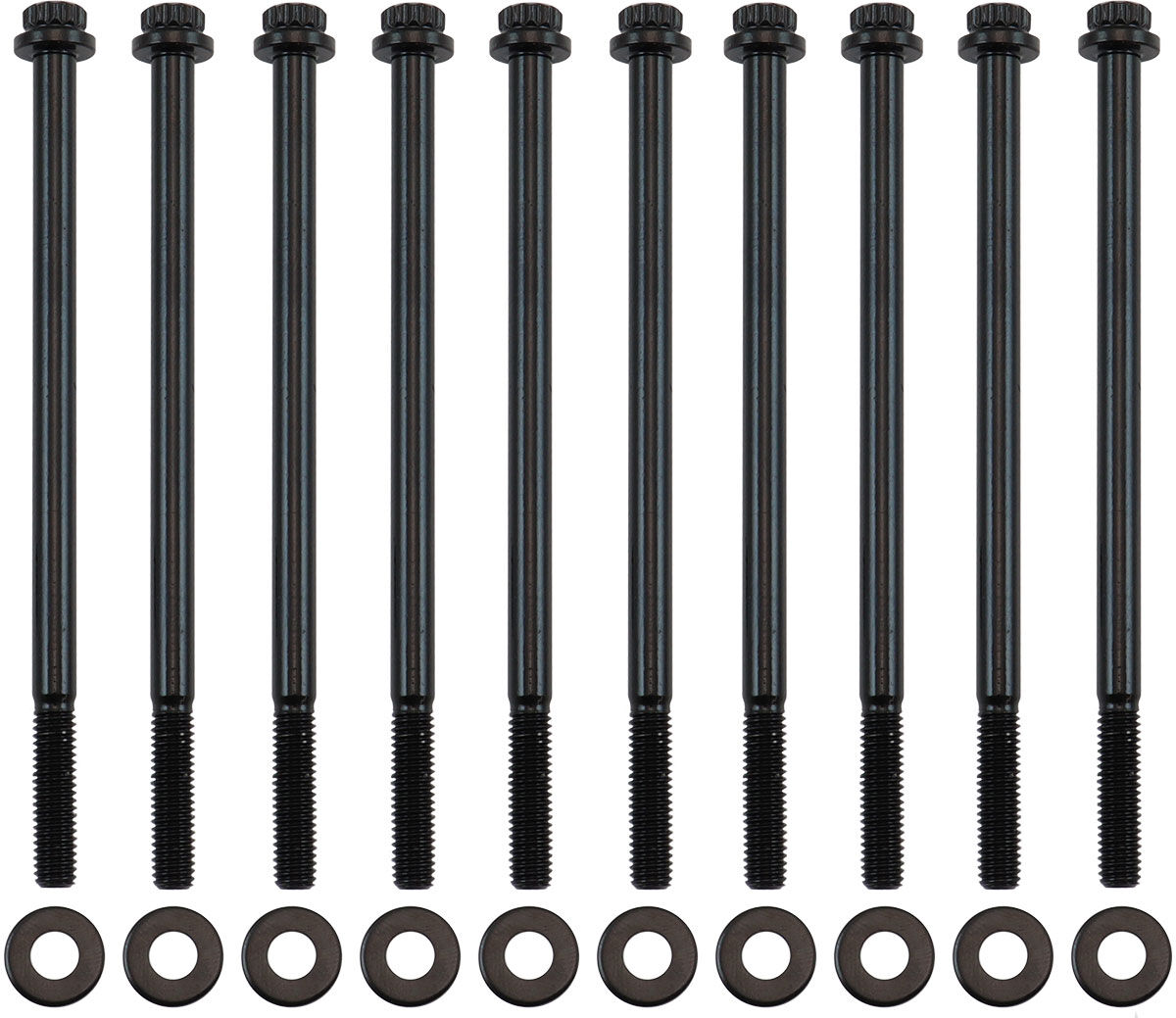 When installing a new intake manifold it is recommended to upgrade your intake bolts, some standard intake manifold bolts won't work depending on aftermarket intake manifolds. These Aeroflow intake bolts are made from chrome moly 8740 for strength. They are coated in a black oxide finish for protection and long-lasting durability. Each bolt features a compact 12-point head which is ideal for use where space is minimal on most aftermarket intake manifolds compared to the factory bolts with a larger head. Each set includes thick flat washers for optimum clamping pressures to ensure a sure seal.