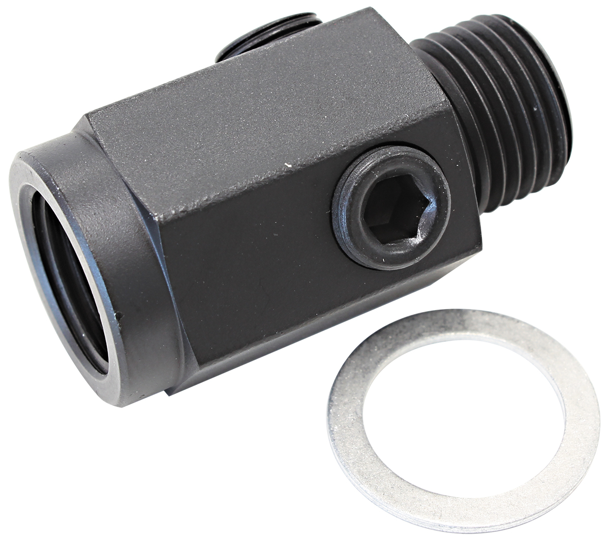 This Aeroflow Performance metric extension adapter with the option of three 1/8” NPT ports are designed for adapting oil pressure and temperature gauge sensors. It includes two 1/8” NPT plugs to block of unused ports. Available in three common metric sizes M12 x 1.5mm, M14 x 1.5mm and M16 x 1.5mm. This adapter is made from steel and coated in black Teflon.