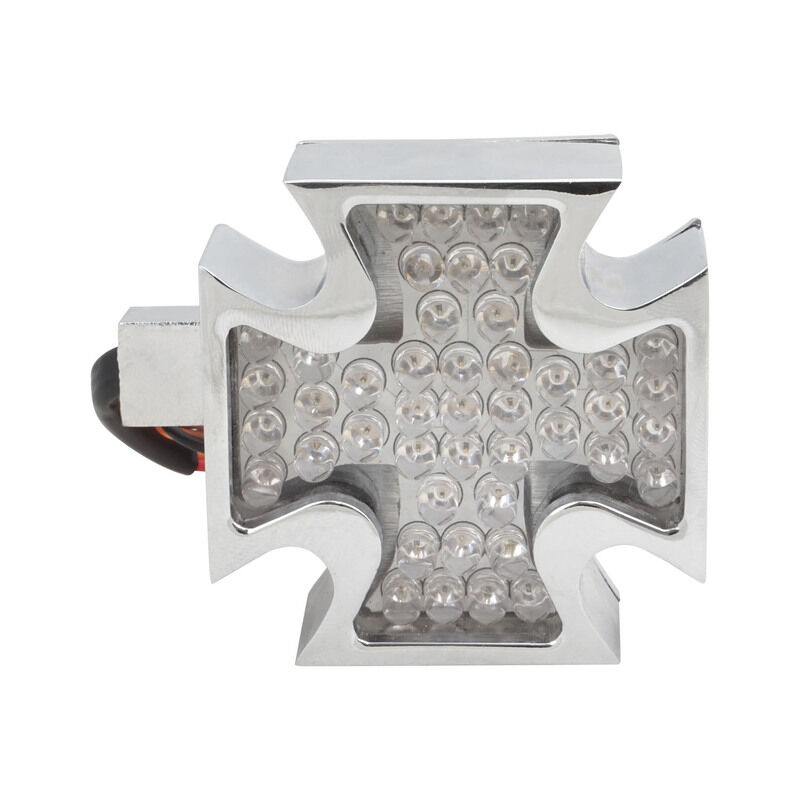 This Iron Cross LED Custom Brake Light from Attitude Inc will give your ride that old school look. Maltese cross design in bright chrome finish with Clear lens. The 45 super bright 5mm red or amber LEDs will get you noticed while cruising down the road and Iron Cross styling will turn heads when you are parked. Adds a custom, stylish look to your motorcycle with its flush mount design. Ideal for customs, Baggers, or retro look motorcycles. Sold 1 per package.