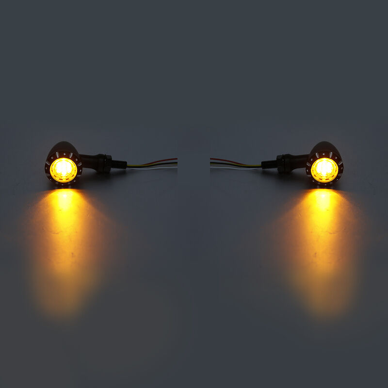 Attitude Inc's Retro Bullet Turn Signal Indicator set are 39mm diameter and 79mm long. Lens is Amber, bulb is LED. Aluminium. Fits all kinds of aftermarket motorcycles.