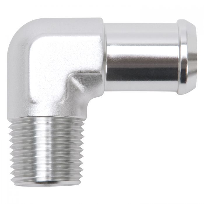 Edelbrock part #8166 heater hose end is designed to hold up to any plumbing task you have. This heater hose end is made from high quality aluminum to ensure they won't rust or corrode. Features 90 deg. end with 1/2" NPT and 3/4" Barb, clear anodized finish.