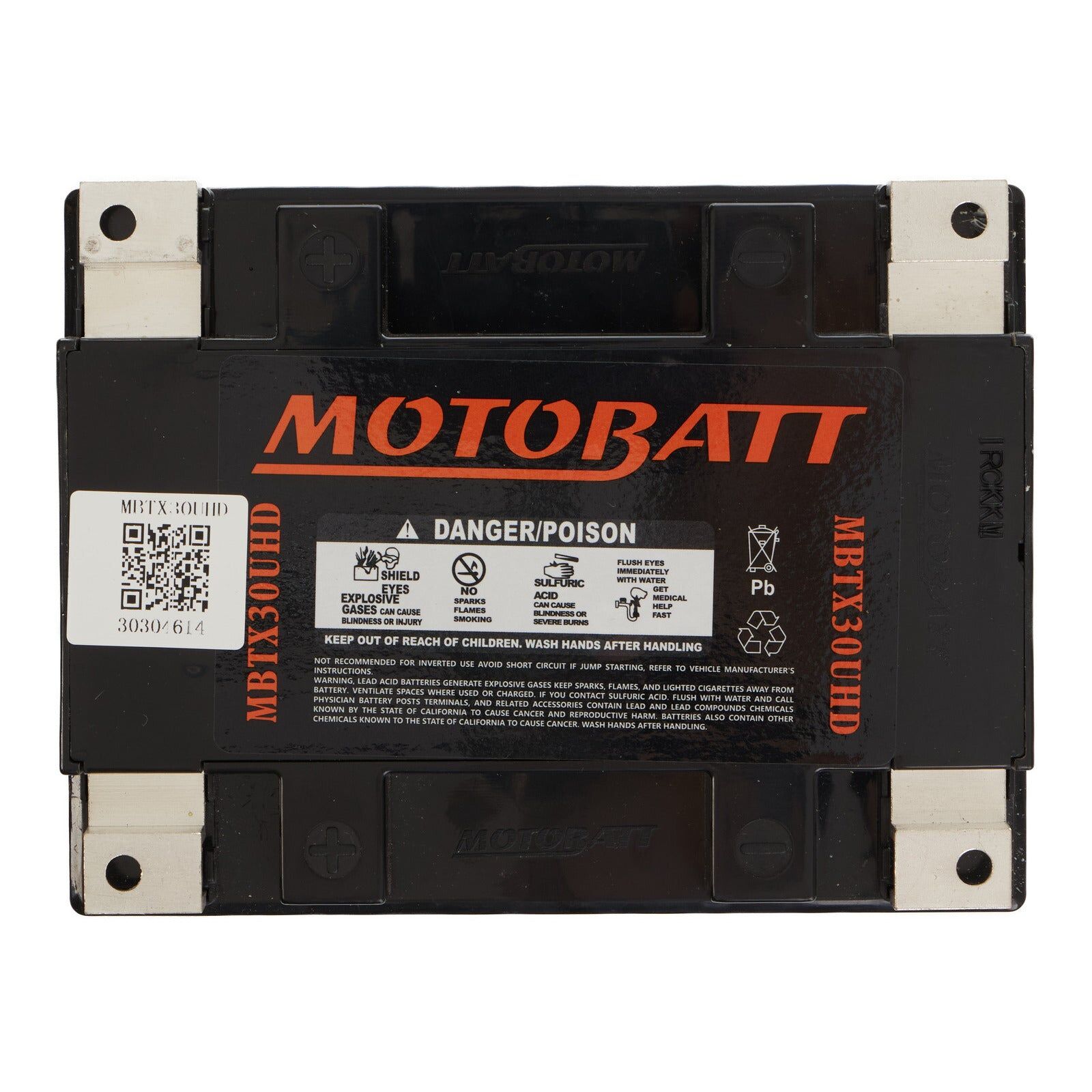 Specifically designed for motorcycles, Motobatt batteries offer much higher cranking power and higher amp hour ratings. Their batteries can withstand constant starting without draining the battery or causing long-term cell damage. Their unique terminal design offers far greater versatility, allowing them to fit a wider range of applications which enables stockists to carry a narrower range of batteries for a large market, which makes it easier for retail customers to find a battery to fit their vehicle, in stock. Motobatt batteries are manufactured from Absorbed Glass Mat (AGM), this design has revolutionised the motorcycle, ATV, lawnmower and small engine industry. QuadFlex provides a unique four-terminal design with two positives, two negatives along with height spacers that permit an almost universal fit. All Motobatt AGM Batteries are maintenance-free, non-hazardous, non-spill, charged and ready to install directly out of the box. Each plate in the battery is wrapped in a fibrous glass matting which not only absorbs all liquid electrolytes but keeps the plates separated in a cushioned environment. This stops the plates from vibrating which can break down the plate and cause short circuits between the plates or break plate welds which results in battery failure. The thick, heavy plates used in Motobatt designs really make the difference. AGM batteries also have a much lower inherent self-discharge rate than wet flooded types. And, as a higher amp hour AGM battery, the Motobatt battery can also discharge more deeply and recover repeatedly under the vehicle alternator charge or through maintenance charging. A standard flooded cell battery is not capable of withstanding this type of cycling without premature failure. Your Motobatt is a Factory Activated battery, it comes to you pre-conditioned and fully charged for optimum performance and ready to install out of the box. 80% of early Powersports battery failure is caused by faulty activation of the dry battery plates. Additionally, you never have to mess with acid or top up fluid levels or remove corrosion from the terminals caused by gassing, which are all common with standard flooded battery types. Specifications: Voltage: 12V C(10) Ah: 33 C(20) Ah: 35 CCA (Cold Cranking Amps): 450A MCA (Marine Cranking Amps): 525A PHCA (Pulse Hot Cranking Amps): 721A Weight: 10.2kg (22.48lbs) Dimensions (LxWxH): 166 x 126 x 175mm (6.54 x 4.96 x 6.89) Terminal Height: 192mm (7.56) Terminals: 2, M6x2.5 (MPT2) Screws: 4, M6x7 (2x MPS2) Allen Wrench: 1, 4x4 (MPAK2) Terminal Caps: 4, 12x5.5 (2x MPC2) Spacer: 17mm Bottom (MPC2), 2 Square Top Corners (MPSC) Features: Patented QuadFlex multi-fit terminals. Absorbed Glass Mat technology – ensures greater protection against vibration and gives a longer lifecycle. Fully sealed – Can be mounted and transported in any position. No initial charging – Install and go, charged right out of the box. Maintenance Free – No messy acid to worry about. 20% more cold cranking amps (CCA). Easy accessory connection with multiple terminals.