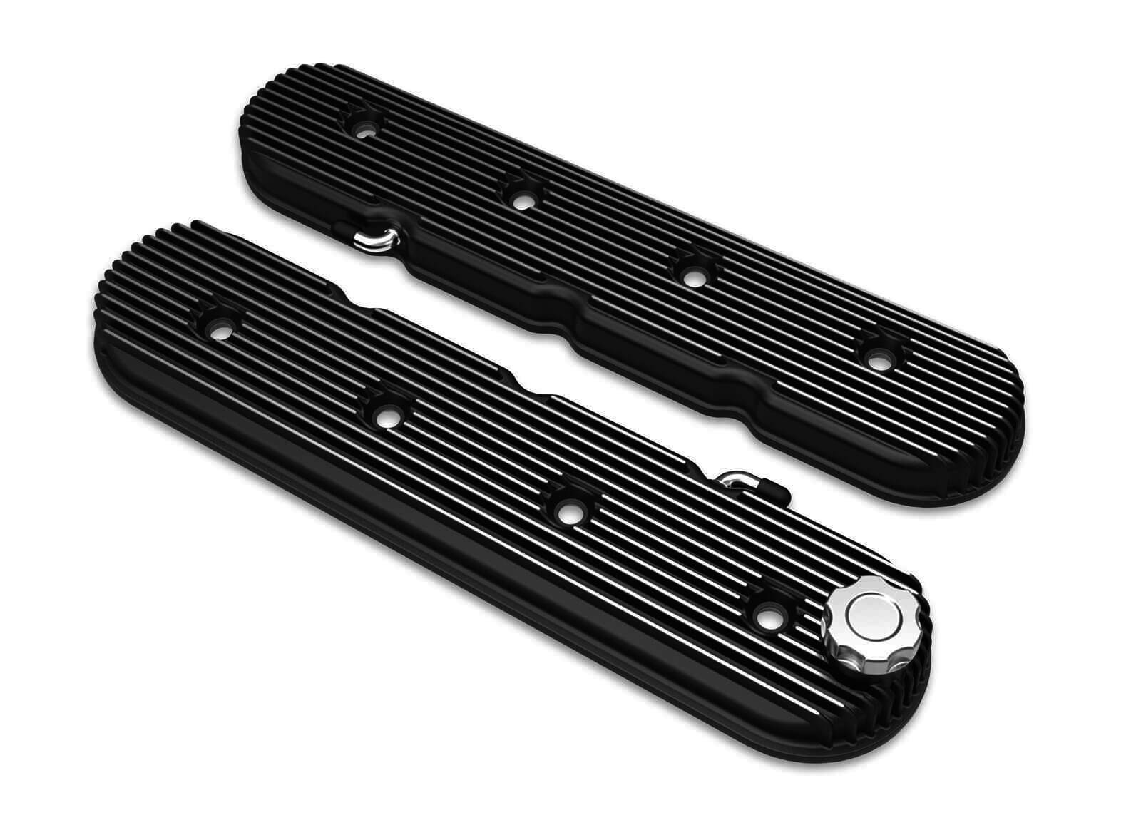 Holley's Vintage Series finned LS valve covers are the latest addition to our ever expanding line of products specifically designed for LS engines. Designed from our existing factory height LS valve covers, these Vintage Series finned valve covers eliminate the coil-on-cover look and instead feature a classic finned design that can add a cool retro style to your modern LS engine. The Holley Vintage Series LS valve covers were engineered to fit LS1, LS2, LS3, LS6 and LS7 engines and will clear up to a .750 lift cam with stock style rocker arms. Manufactured from die cast aluminum for a high quality finish, these valve covers includes an integrated OE style baffle and ventilation system, and a billet aluminum oil fill cap. Customers are encouraged to reuse the factory valve cover bolt assemblies or replace them with an LS valve cover bolt assembly (bolt and grommet) that better fits the style of their build. The OE valve cover gaskets are reusable, though they may need to be replaced over time - please check them carefully before installation to determine if a replacement is necessary. Dress up your LS today with Holley's Vintage Series finned LS valve covers! Features: Retro finned design gives your modern LS engine a touch of true vintage flair Eliminates unsightly OE coil brackets and messy coil-on-cover styling Engineered to fit all GM LS1, LS2, LS3, LS6 and LS7 engines Standard height allows for easy installation and a custom look while retaining all OE valve train clearances (clears up to 0.750 lift cam with stock style rocker arms) Manufactured from high quality die cast aluminum Features a proven OE style baffle and ventilation system to keep your engine breathing easy Includes a billet aluminum oil fill cap Available in four unique finishes: Natural Cast, Polished, Satin Black (lightly textured) with Machined Fins, and Factory Orange with Machined Fins