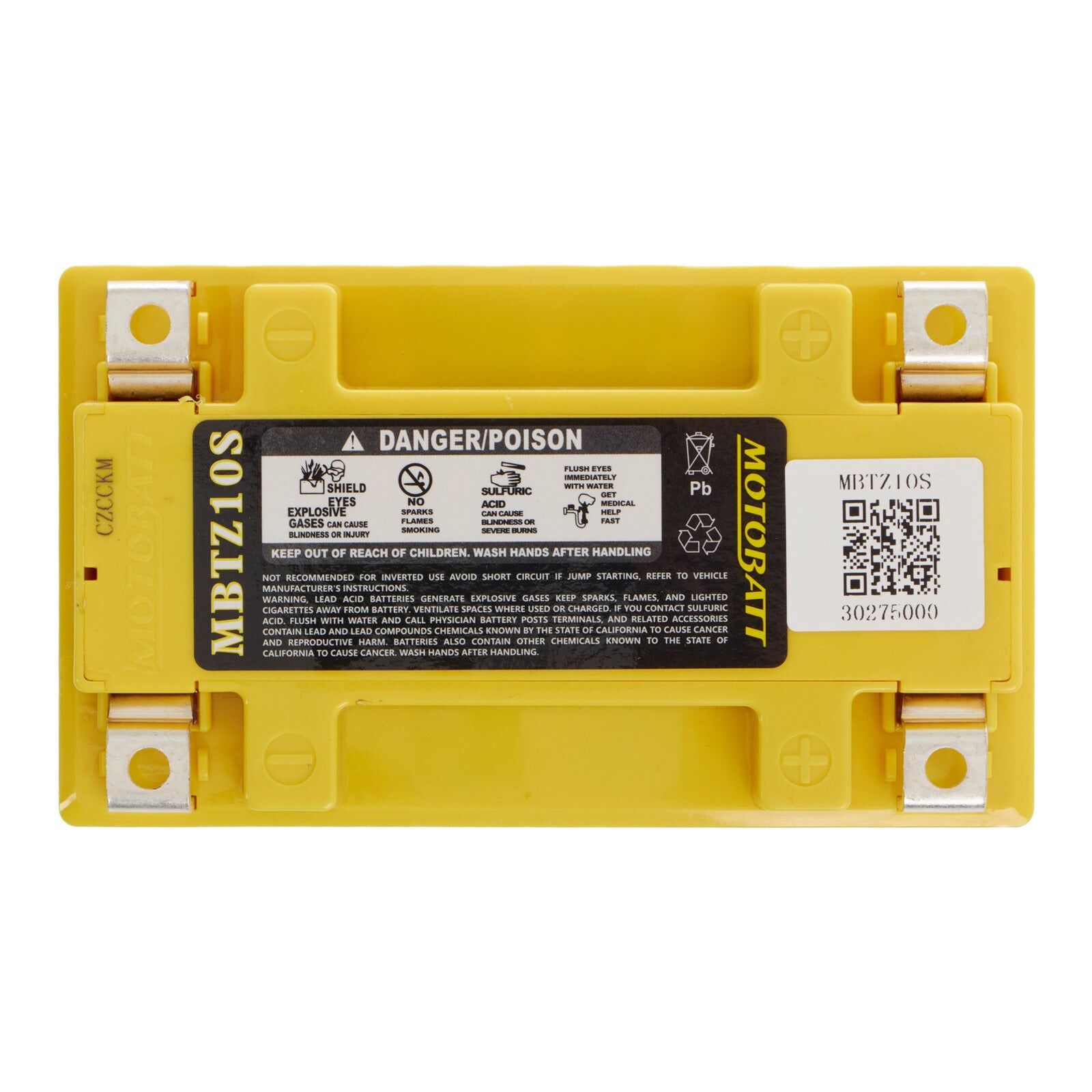 Specifically designed for motorcycles, Motobatt batteries offer much higher cranking power and higher amp hour ratings. Their batteries can withstand constant starting without draining the battery or causing long-term cell damage. Their unique terminal design offers far greater versatility, allowing them to fit a wider range of applications which enables stockists to carry a narrower range of batteries for a large market, which makes it easier for retail customers to find a battery to fit their vehicle, in stock. Motobatt batteries are manufactured from Absorbed Glass Mat (AGM), this design has revolutionised the motorcycle, ATV, lawnmower and small engine industry. QuadFlex provides a unique four-terminal design with two positives, two negatives along with height spacers that permit an almost universal fit. All Motobatt AGM Batteries are maintenance-free, non-hazardous, non-spill, charged and ready to install directly out of the box. Each plate in the battery is wrapped in a fibrous glass matting which not only absorbs all liquid electrolytes but keeps the plates separated in a cushioned environment. This stops the plates from vibrating which can break down the plate and cause short circuits between the plates or break plate welds which results in battery failure. The thick, heavy plates used in Motobatt designs really make the difference. AGM batteries also have a much lower inherent self-discharge rate than wet flooded types. And, as a higher amp hour AGM battery, the Motobatt battery can also discharge more deeply and recover repeatedly under the vehicle alternator charge or through maintenance charging. A standard flooded cell battery is not capable of withstanding this type of cycling without premature failure. Your Motobatt is a Factory Activated battery, it comes to you pre-conditioned and fully charged for optimum performance and ready to install out of the box. 80% of early Powersports battery failure is caused by faulty activation of the dry battery plates. Additionally, you never have to mess with acid or top up fluid levels or remove corrosion from the terminals caused by gassing, which are all common with standard flooded battery types. Specifications: Voltage: 12V C(10) Ah: 8.6 C(20) Ah: 9.1 CCA (Cold Cranking Amps): 165A MCA (Marine Cranking Amps): 219A PHCA (Pulse Hot Cranking Amps): 395A Weight: 2.9kg (6.39lbs) Dimensions (LxWxH): 151 x 87 x 95mm (5.94 x 3.43 x 3.74) Terminals: 2, M6x2.5 (MPT2) Screws: 4, M6x7 (2x MPS2) Allen Wrench: 1, 4x4 (MPAK2) Terminal Caps: 4, 12x5.5 (2x MPC2) Spacer: None Features: Patented QuadFlex multi-fit terminals. Absorbed Glass Mat technology – ensures greater protection against vibration and gives a longer lifecycle. Fully sealed – Can be mounted and transported in any position. No initial charging – Install and go, charged right out of the box. Maintenance Free – No messy acid to worry about. 20% more cold cranking amps (CCA). Easy accessory connection with multiple terminals.