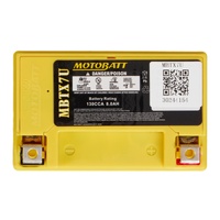 Specifically designed for motorcycles, Motobatt batteries offer much higher cranking power and higher amp hour ratings. Their batteries can withstand constant starting without draining the battery or causing long-term cell damage. Their unique terminal design offers far greater versatility, allowing them to fit a wider range of applications which enables stockists to carry a narrower range of batteries for a large market, which makes it easier for retail customers to find a battery to fit their vehicle, in stock. Motobatt batteries are manufactured from Absorbed Glass Mat (AGM), this design has revolutionised the motorcycle, ATV, lawnmower and small engine industry. QuadFlex provides a unique four-terminal design with two positives, two negatives along with height spacers that permit an almost universal fit. All Motobatt AGM Batteries are maintenance-free, non-hazardous, non-spill, charged and ready to install directly out of the box. Each plate in the battery is wrapped in a fibrous glass matting which not only absorbs all liquid electrolytes but keeps the plates separated in a cushioned environment. This stops the plates from vibrating which can break down the plate and cause short circuits between the plates or break plate welds which results in battery failure. The thick, heavy plates used in Motobatt designs really make the difference. AGM batteries also have a much lower inherent self-discharge rate than wet flooded types. And, as a higher amp hour AGM battery, the Motobatt battery can also discharge more deeply and recover repeatedly under the vehicle alternator charge or through maintenance charging. A standard flooded cell battery is not capable of withstanding this type of cycling without premature failure. Your Motobatt is a Factory Activated battery, it comes to you pre-conditioned and fully charged for optimum performance and ready to install out of the box. 80% of early Powersports battery failure is caused by faulty activation of the dry battery plates. Additionally, you never have to mess with acid or top up fluid levels or remove corrosion from the terminals caused by gassing, which are all common with standard flooded battery types. Specifications: Voltage: 12V C(10) Ah: 8 C(20) Ah: 8.5 CCA (Cold Cranking Amps): 130A MCA (Marine Cranking Amps): 190A PHCA (Pulse Hot Cranking Amps): 360A Weight: 2.6kg (5.73lbs) Dimensions (LxWxH): 114 x 70 x 128mm (4.49 x 2.76 x 5.04) Terminals: 2, M5x2.5 (MPT1) Screws: 4, M5x7 (2x MPS1) Allen Wrench: 1, 3x3 (MPAK1) Terminal Caps: 2, 11x5.5 (MPC1) Spacer: None Features: Patented QuadFlex multi-fit terminals. Absorbed Glass Mat technology – ensures greater protection against vibration and gives a longer lifecycle. Fully sealed – Can be mounted and transported in any position. No initial charging – Install and go, charged right out of the box. Maintenance Free – No messy acid to worry about. 20% more cold cranking amps (CCA). Easy accessory connection with multiple terminals.