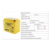Specifically designed for motorcycles, Motobatt batteries offer much higher cranking power and higher amp hour ratings. Their batteries can withstand constant starting without draining the battery or causing long-term cell damage. Their unique terminal design offers far greater versatility, allowing them to fit a wider range of applications which enables stockists to carry a narrower range of batteries for a large market, which makes it easier for retail customers to find a battery to fit their vehicle, in stock. Motobatt batteries are manufactured from Absorbed Glass Mat (AGM), this design has revolutionised the motorcycle, ATV, lawnmower and small engine industry. QuadFlex provides a unique four-terminal design with two positives, two negatives along with height spacers that permit an almost universal fit. All Motobatt AGM Batteries are maintenance-free, non-hazardous, non-spill, charged and ready to install directly out of the box. Each plate in the battery is wrapped in a fibrous glass matting which not only absorbs all liquid electrolytes but keeps the plates separated in a cushioned environment. This stops the plates from vibrating which can break down the plate and cause short circuits between the plates or break plate welds which results in battery failure. The thick, heavy plates used in Motobatt designs really make the difference. AGM batteries also have a much lower inherent self-discharge rate than wet flooded types. And, as a higher amp hour AGM battery, the Motobatt battery can also discharge more deeply and recover repeatedly under the vehicle alternator charge or through maintenance charging. A standard flooded cell battery is not capable of withstanding this type of cycling without premature failure. Your Motobatt is a Factory Activated battery, it comes to you pre-conditioned and fully charged for optimum performance and ready to install out of the box. 80% of early Powersports battery failure is caused by faulty activation of the dry battery plates. Additionally, you never have to mess with acid or top up fluid levels or remove corrosion from the terminals caused by gassing, which are all common with standard flooded battery types. Specifications: Voltage: 12V C(10) Ah: 21 C(20) Ah: 22.3 CCA (Cold Cranking Amps): 320A MCA (Marine Cranking Amps): 407A PHCA (Pulse Hot Cranking Amps): 624A Weight: 6.5kg (14.33lbs) Dimensions (LxWxH): 175 x 87 x 155mm (6.89 x 3.43 x 6.1) Terminal Height 1: 100mm (3.94) Terminal Height 2: 175mm (6.89) Terminals: 4, M6x2.5 (MPT2 & MPT3) Screws: 4, M6x7 (2x MPS2) Allen Wrench: 1, 4x4 (MPAK2) Terminal Caps: 4, 12x5.5 (2x MPC2) Spacer: 20mm Bottom (MPBS7), 13mm Back (MPSS) Features: Patented QuadFlex multi-fit terminals. Absorbed Glass Mat technology – ensures greater protection against vibration and gives a longer lifecycle. Fully sealed – Can be mounted and transported in any position. No initial charging – Install and go, charged right out of the box. Maintenance Free – No messy acid to worry about. 20% more cold cranking amps (CCA). Easy accessory connection with multiple terminals.