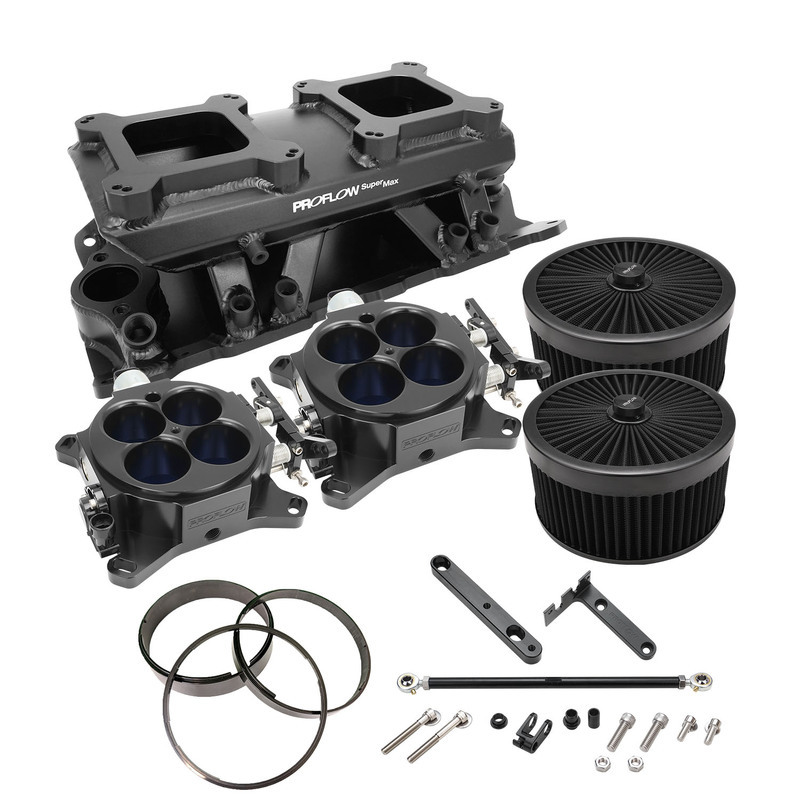 Proflow's SuperMax fabricated intake manifolds are cost effective and performance filled! These black powdercoated intake manifolds feature 3mm (1/8") thick 6061-T6 sheet aluminum construction with 100% TIG welds for strength and durability. The tapered intake runners are designed to increase air velocity to evenly distribute airflow to all 8 cylinders, improving throttle response and providing consistent volumetric efficiency for your engine. m. SuperMax manifolds are intended for maximum performance applications and will work best with upgraded engine components and hardware, such as upgraded camshafts and cylinder heads. The Tunnel Ram intakes have 4150 flange bolt patterns for carburettors or throttle bodies. Includes: 1x Fabricated Intake Manifold 2x Quad Throttle Bodies 2x Air filters 9"x4" 2x Air Filter Spacer Kit 1x Throttle Body Linkage Kit 2x 4150 Open Plenum Base Gaskets 2 x 5-1/8" Air Cleaner Gaskets Features: 3mm thick T6061 Sheet Aluminum construction, more durable than competitive intakes EFI Versions are Available in 92mm and 102mm bore Throttle Body 100% TIG welded Available for EFI and Carbureted applications with custom Holley Sniper logo Carby or EFI Versions with include 3/8" Billet Fuel rail kits Runner lengths with tapered top on EFI intakes designed to increase velocity and more evenly distribute airflow 2x 4150 Open Plenum Base Gaskets 2 x 5-1/8" Air Cleaner Gaskets